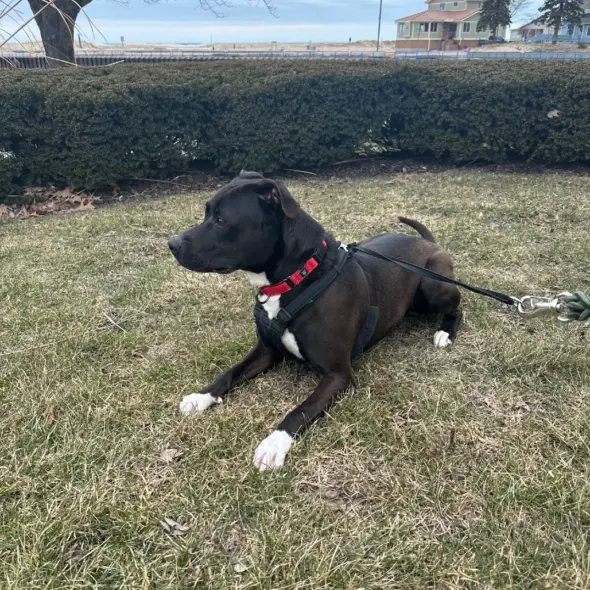 While his name suggests nonstop energy, Bouncer does have a softer side as well. He still has a playful bounce, but what he really wants is to be close to his people. He loves ear massages, butt scratches, and just hanging out nearby. He walks well on a harness, keeps an eye on any suspicious squirrels, and can look a little intimidating at first glance, until you realize he’s actually a total softie.